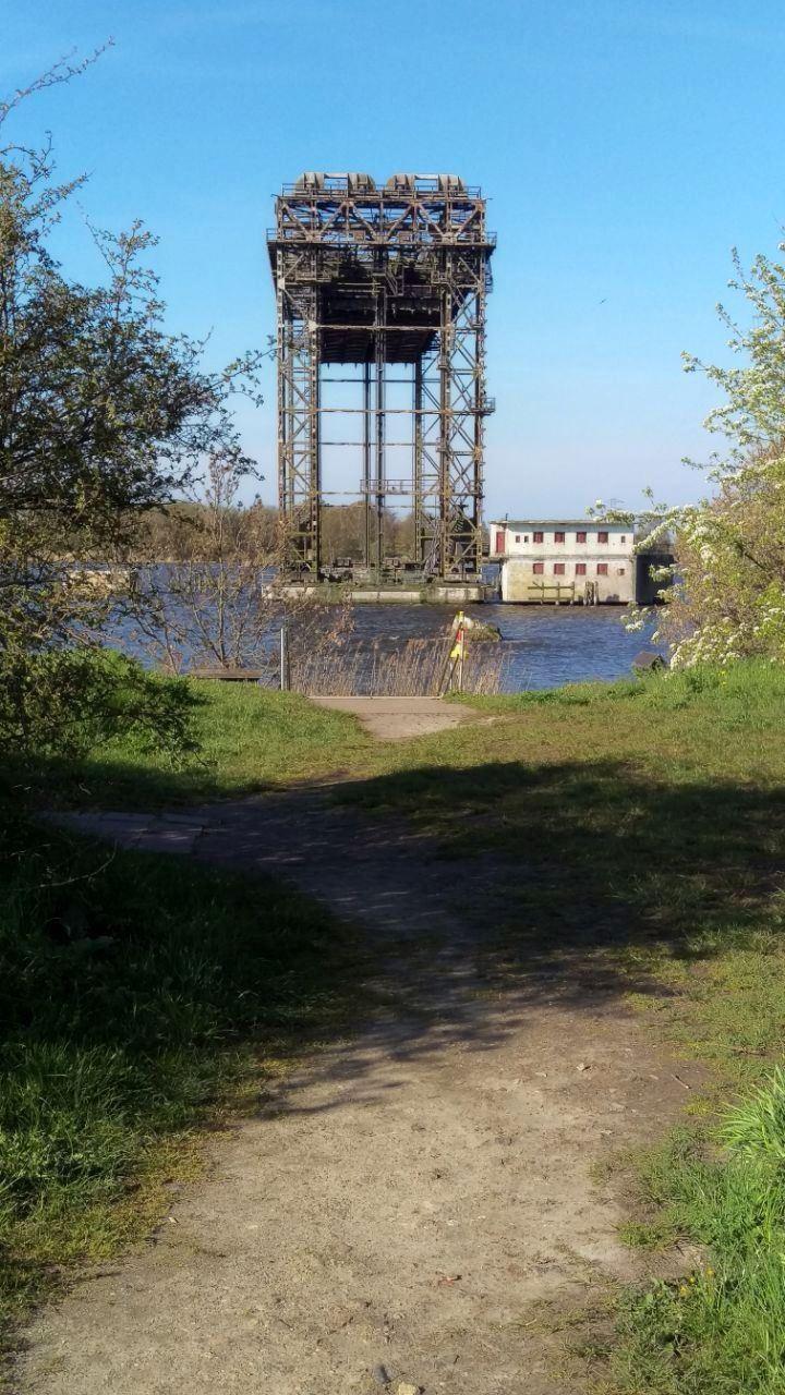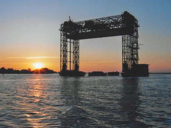 Hubbrücke Karnin am Stettiner Haff - eine 1933 eröffnete und 1945 zerstörte Eisenbahnbrücke über den Peenestrom. Sie war Bestandteil der ehemaligen Eisenbahnlinie Ducherow–Swinemünde. Das Hubteil der Brücke steht seit Kriegsende als unverändertes Fragment und als technisches Denkmal mitten im Peenestrom.